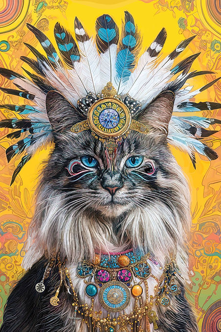 This evolution gave birth to The Shamanic Cats, a series where ancestral cultures, sacred geometry, and powerful chromatic frequencies merge to create visual talismans. Each piece is a fusion of energies: the medicine of shamans, the teachings of native traditions, and the healing presence of feline spirit.